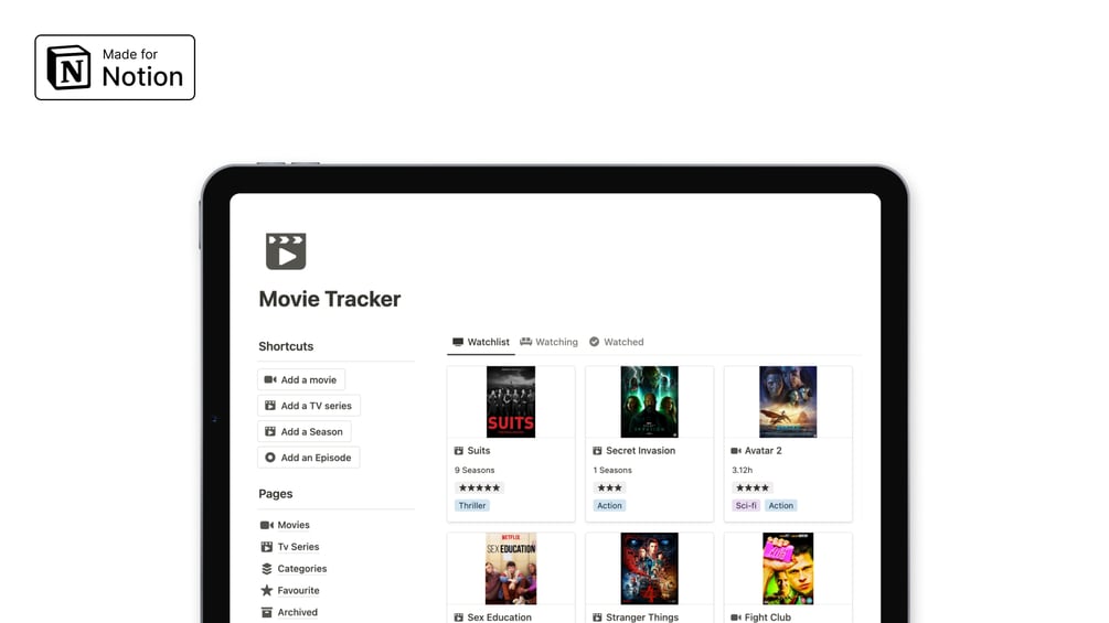 Whether you're a film fanatic or a series binge-watcher, this template will help you manage your watchlist, keep tabs on your favorites, and ensure you're always up-to-date.