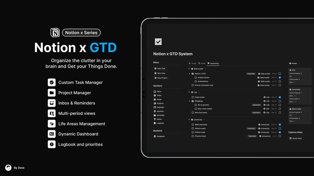 Notion x GTD System is the perfect all-in-one solution, bringing David Allen's renowned "Getting Things Done" method to life within the powerful Notion platform. Get access to a curated template designed to streamline your tasks and projects, categorize them by areas of life (business, personal, education, etc.), and provide you with an interactive dashboard and sidebar for quick access to everything you need. Say goodbye to scattered thoughts and missed deadlines - welcome to a new era of productivity and efficiency.